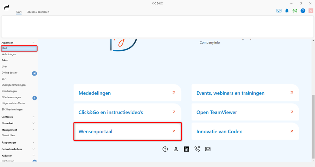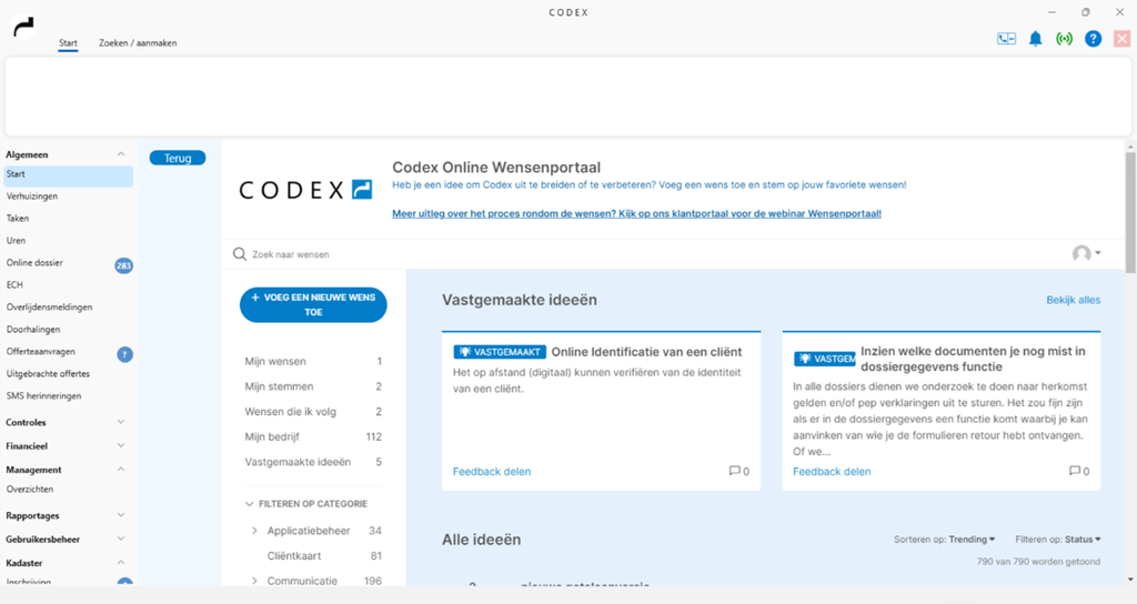 Als gebruikers van het softwareprogramma Codex hebben jullie vaak goede input over wat er nog beter kan in onze software. Deze input kunnen jullie bij ons indienen als wens via het Wensenportaal. Het Wensenportaal is te vinden op onze Startpagina.